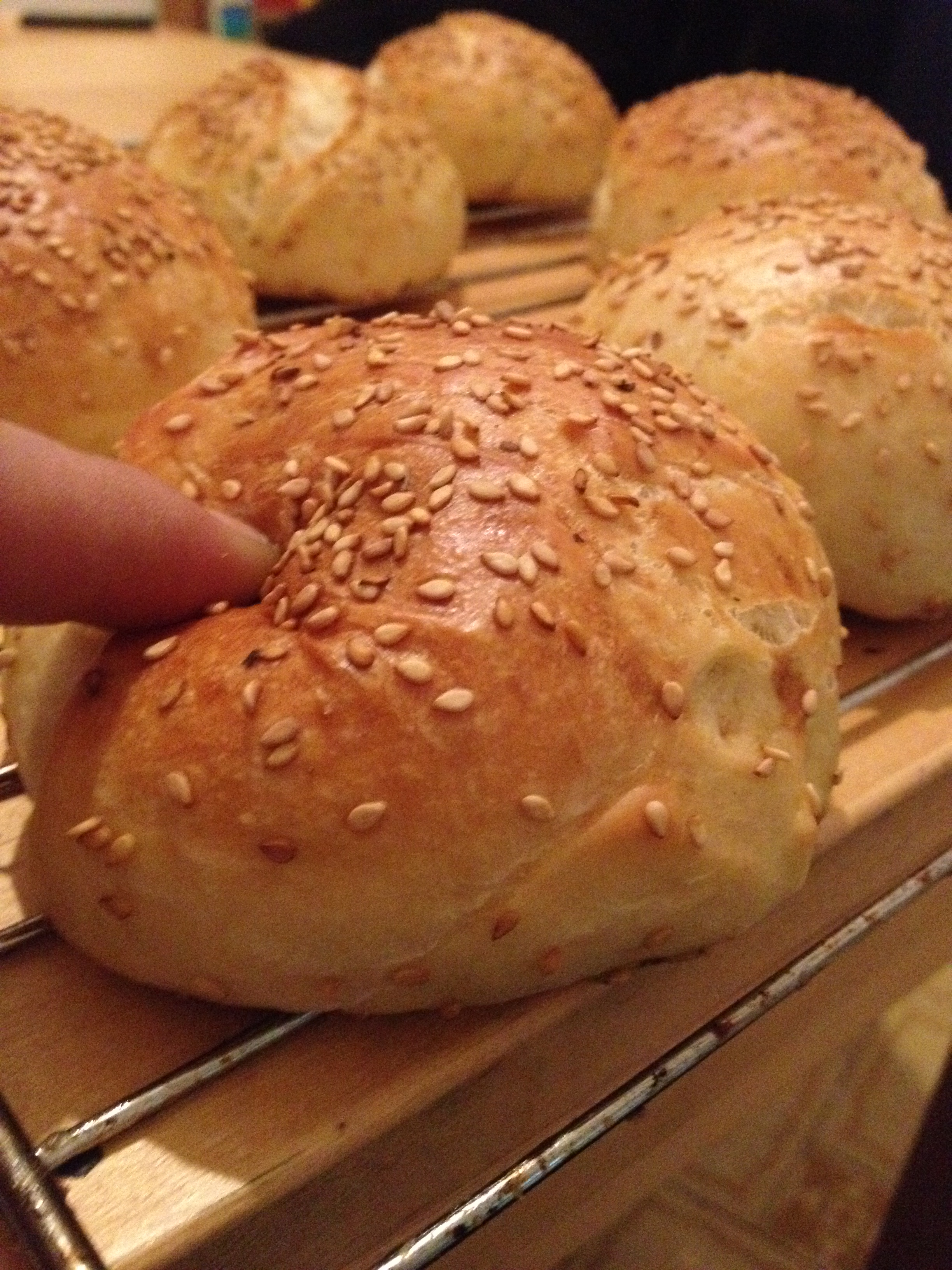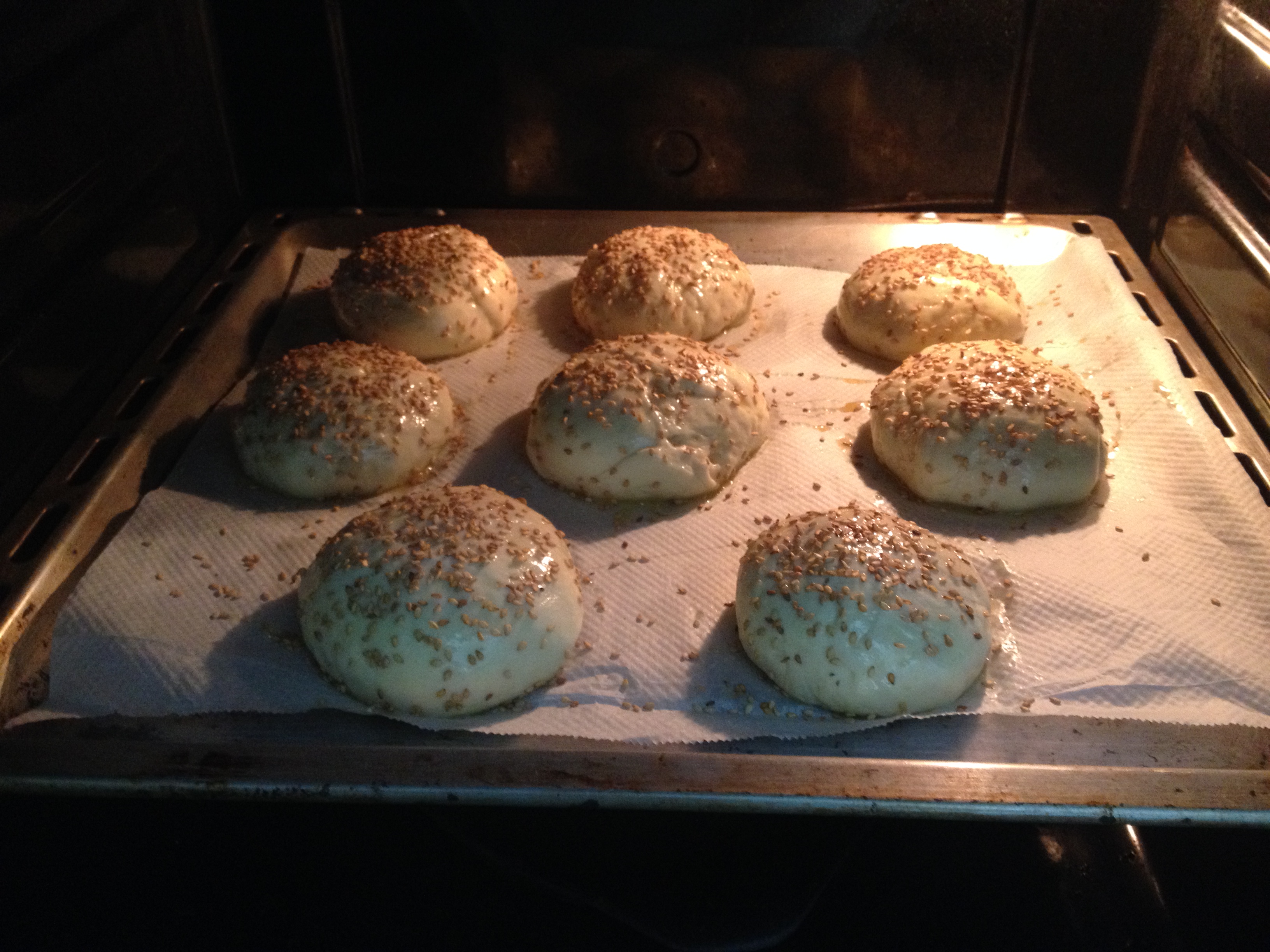 Pasado ese tiempo, precalentamos el horno a 220º. En el suelo del horno, ponemos un cuenco resistente donde luego pondremos agua para recrear un horno de vapor. Pintamos los panes con huevo batido y espolvoreamos por encima el sésamo. Introducimos los panes al horno, tiramos un vaso de agua al recipiente y cerramos rápidamente el horno, que veremos que es una fiesta del vapor.