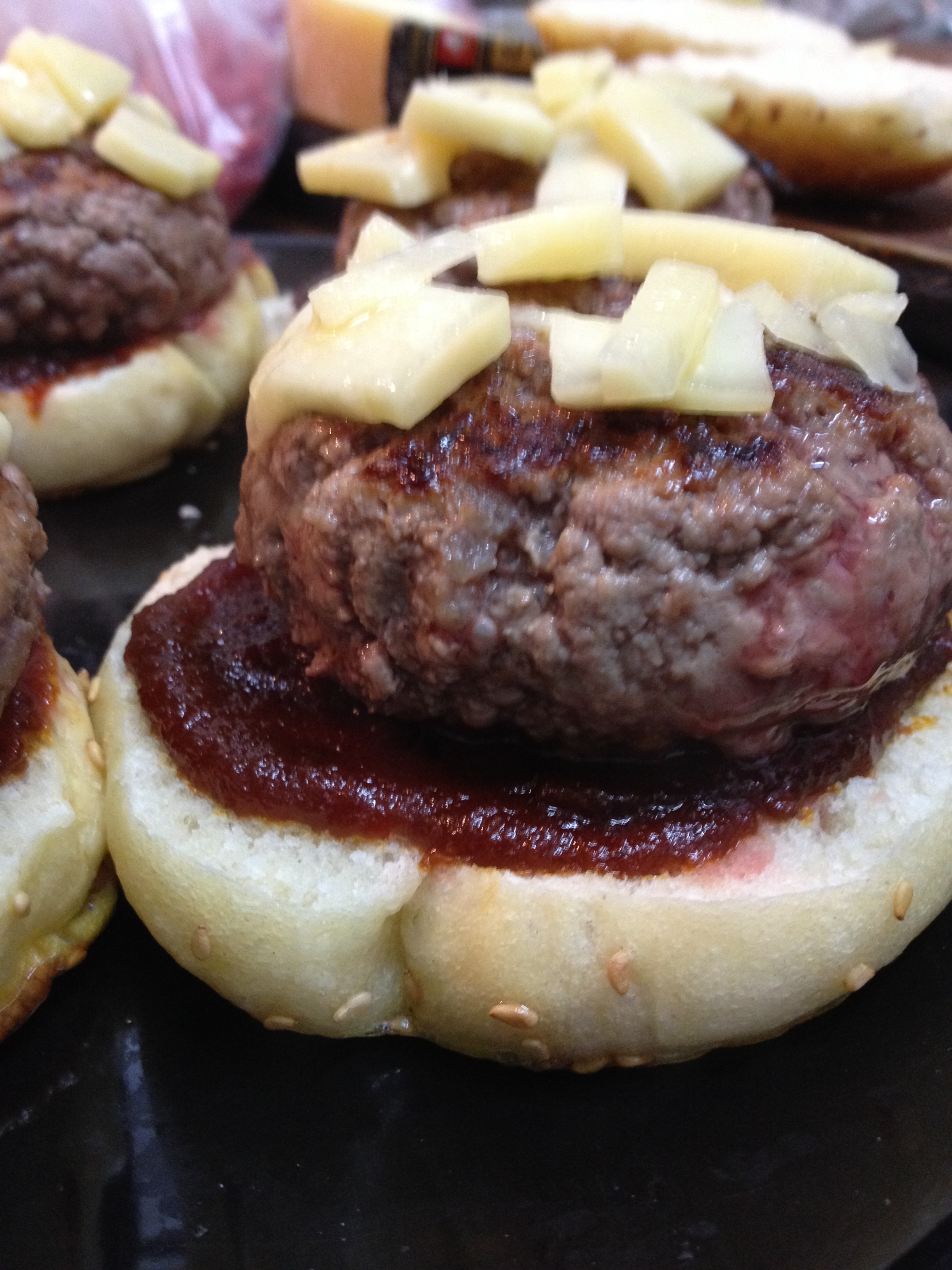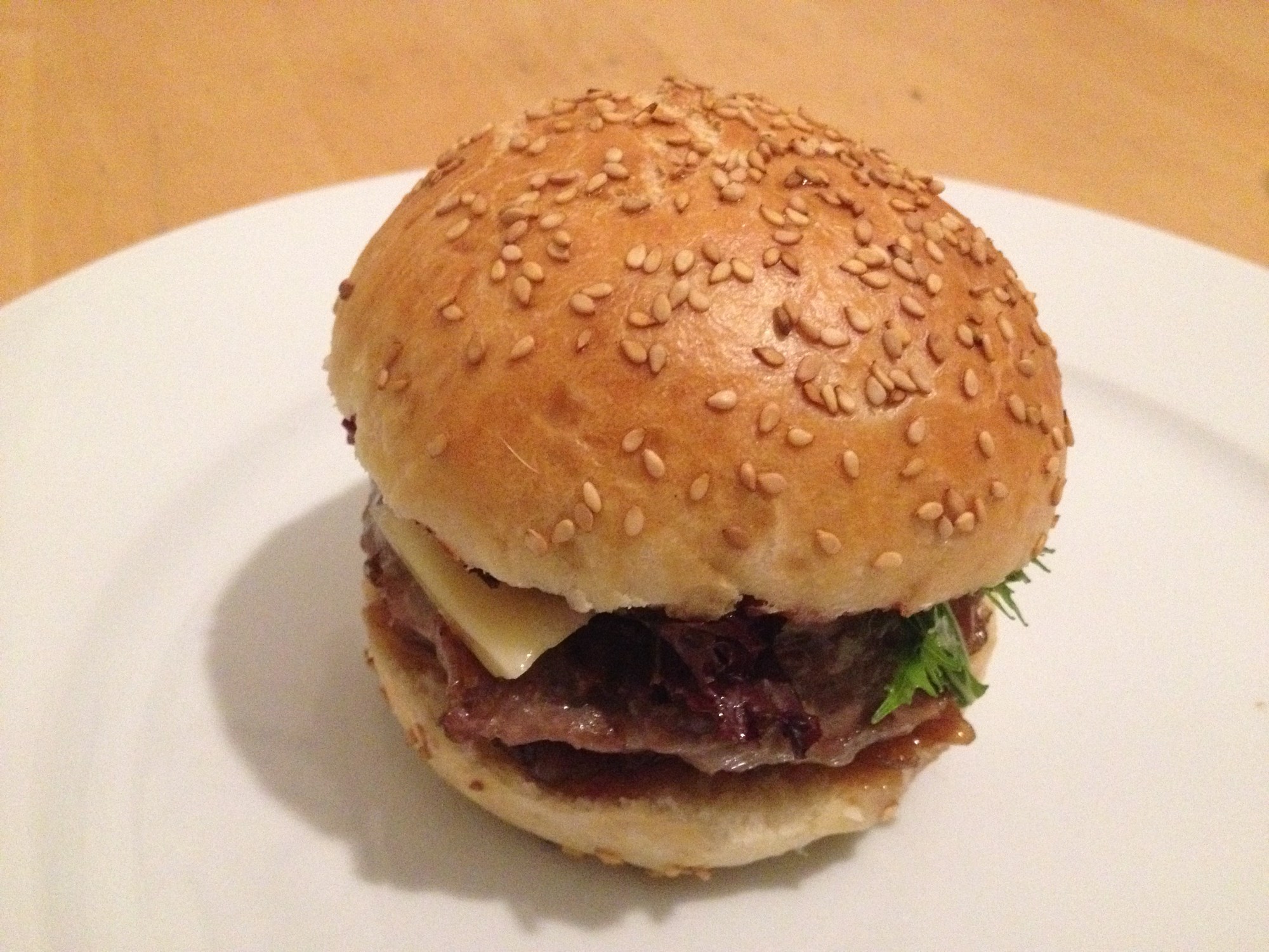 Mientras se están haciendo, no tocamos las hamburguesas, ni las movemos, ni nada. Pasado el tiempo de la primera cara, damos la vuelta a las hamburguesas y sólo una vez, chafamos un segundo la carne para sellar bien esa cara (un segundo es suficiente; no te vuelvas crazy). Ponemos los trozos de queso appenzeller que creamos oportunos. Este queso es holandés y tiene un punto graso muy rico y a veces recuerda al morder al parmesano. Como no soy experto en paladar, probadlo vosotros y ya veréis si os gusta. Si tenéis cualquier otro queso, podéis ponerle tranquilamente en lugar del appenzeller. Esperamos el tiempo correspondiente a nuestra cocción y ya estamos listos para montar la hamburguesa.