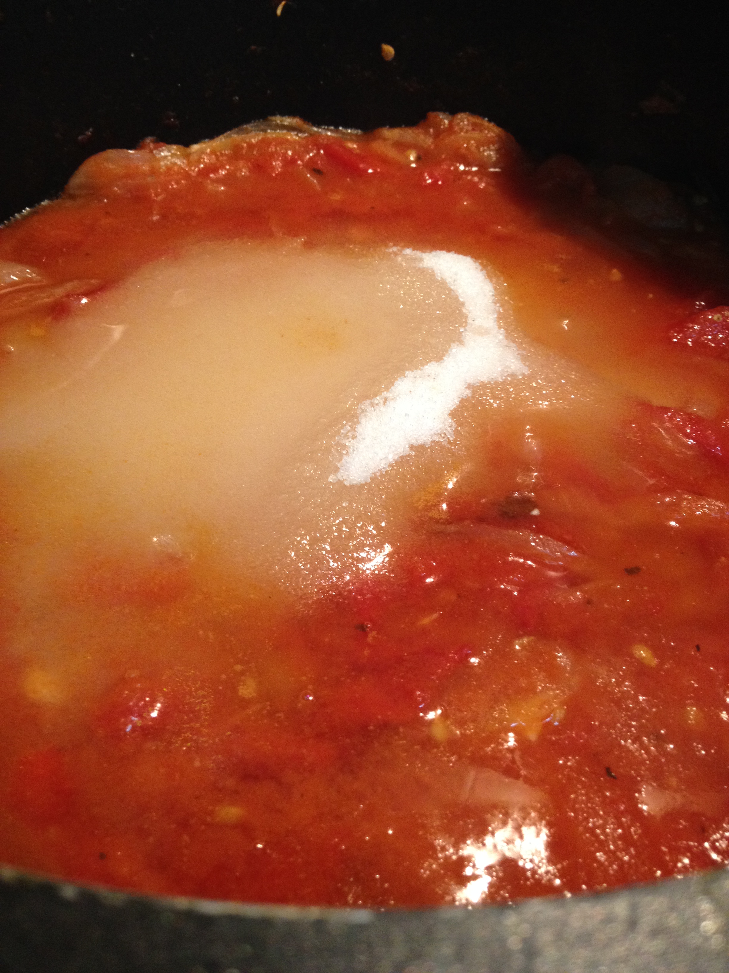 Pasado el tiempo, aplastamos el tomate bien con una cuchara de madera e incorporamos el azúcar y el vinagre.