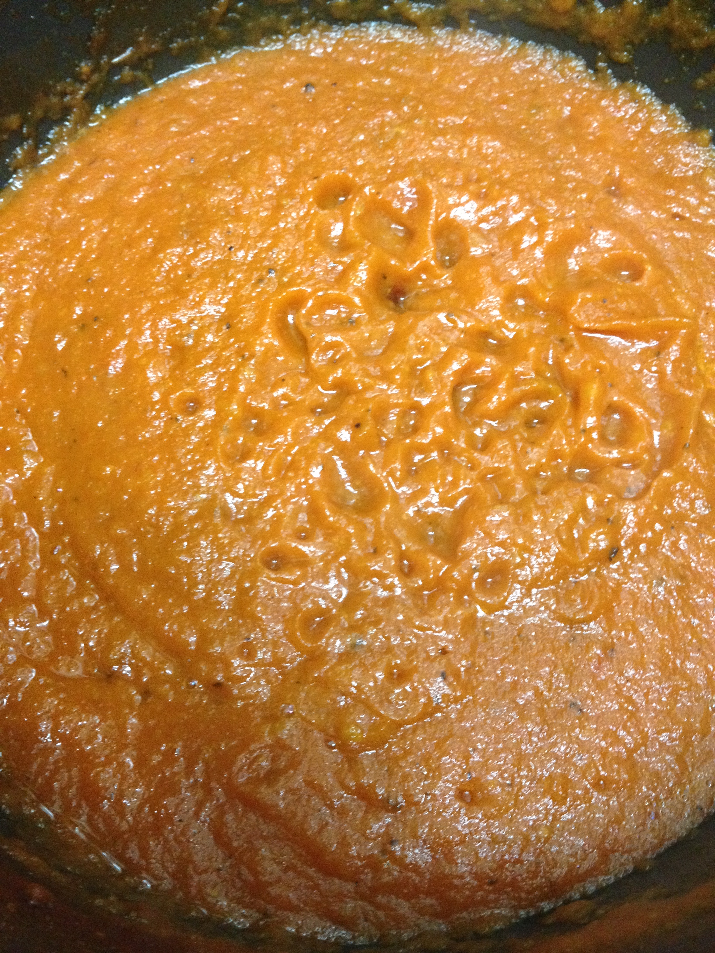 Pasado el tiempo, sacamos de la cazuela, trituramos hasta que quede lo más fino posible y pasamos por un colador fino.