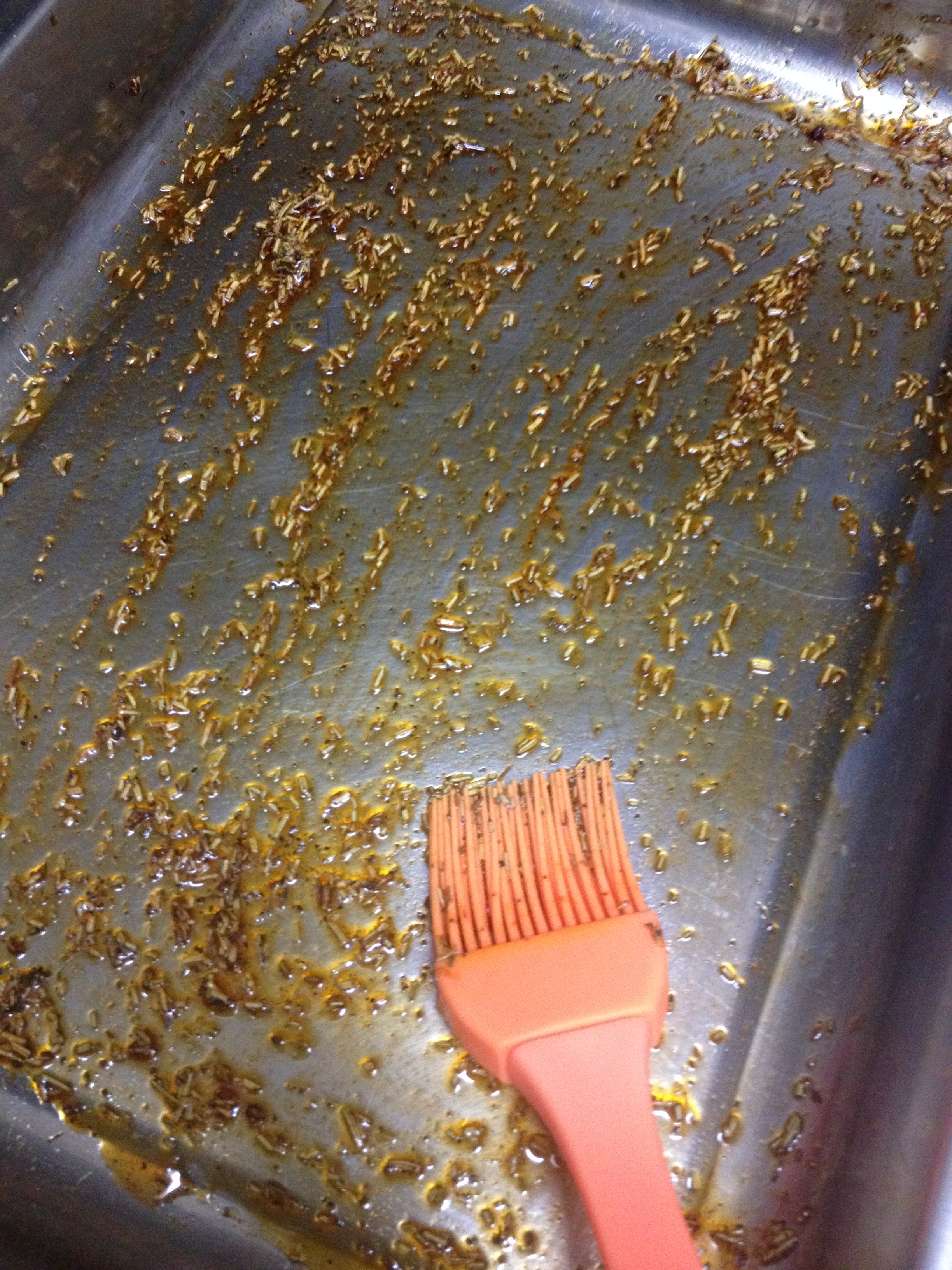 Por otro lado, mezclamos el resto de especias (orégano, pimentón, tomillo, romero) con una cucharada de aceite y pintamos la bandeja donde vamos a poner la carne.