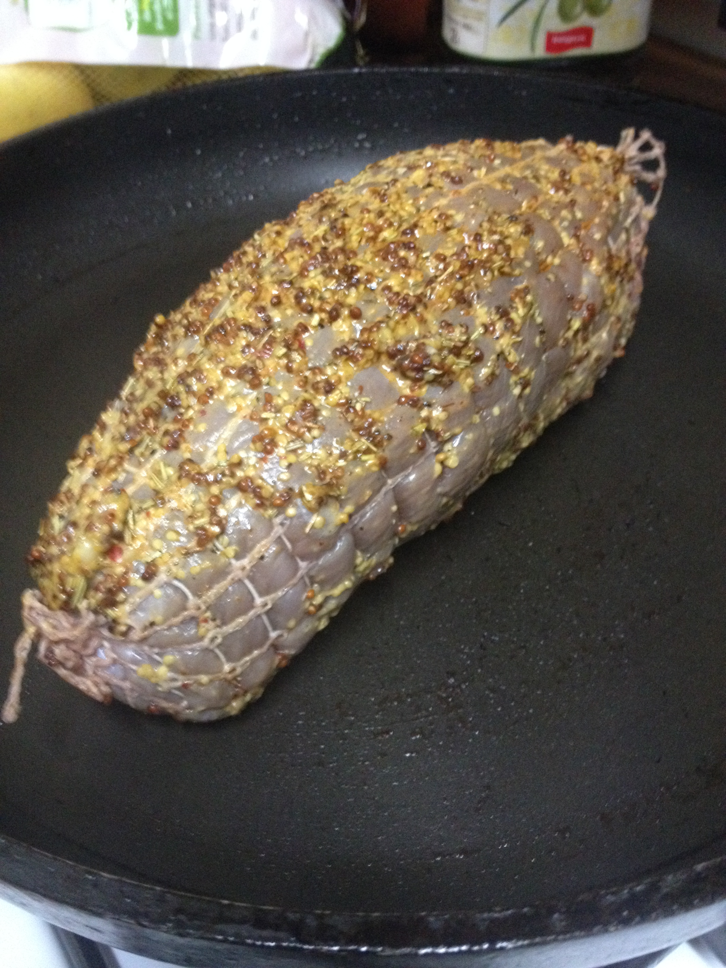 Precalentamos el horno a 180º. Mientras, marcamos la carne (muchas veces este tipo de redondos vienen con una malla que les mantiene la forma) en una sartén muy caliente, sin nada de aceite y sin especiar.