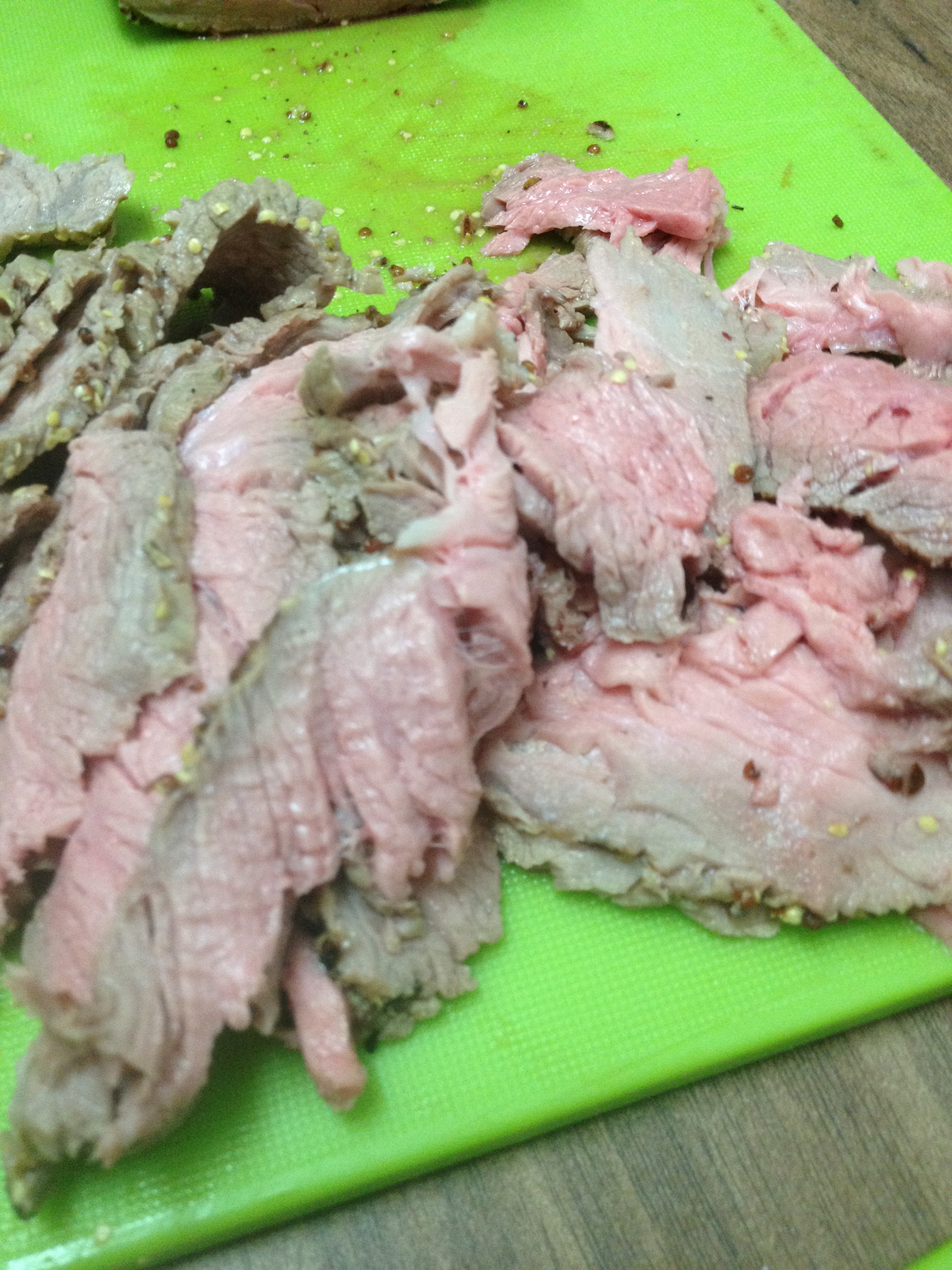 Pasado el tiempo, sacamos la carne y la dejamos enfriar mínimo 10 minutos (aprovechamos para subir el horno a 200º para la coca). Cuando esté más reposada, vamos a cortarla en filetes lo más finos posible. El centro tiene que quedar rosita y bien jugoso.