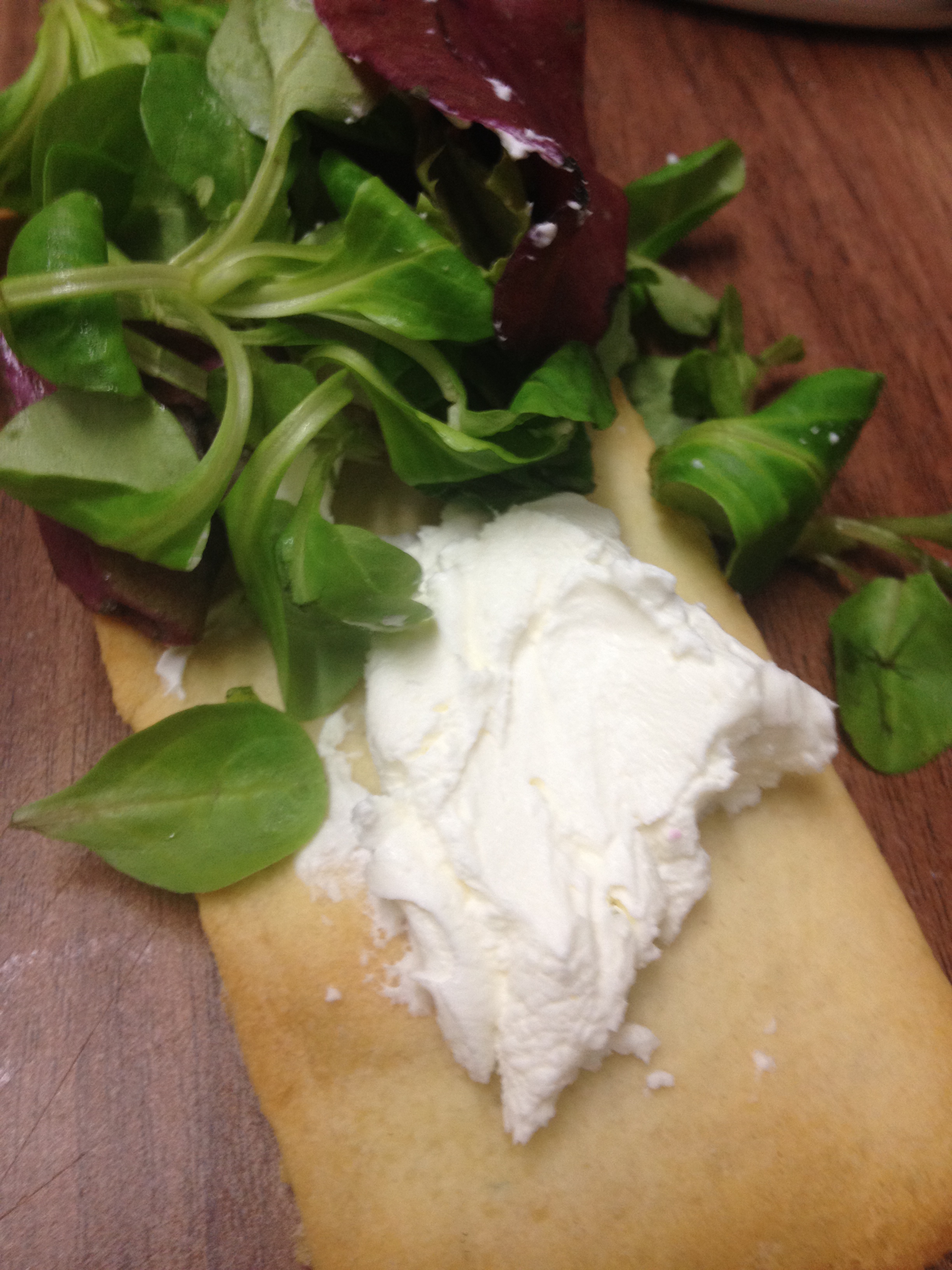 Cuando tengamos todos los ingredientes, montamos el plato poniendo un par de cucharadas de queso cremoso sobre la coca, con cuidado de no hacerla añicos y sobre el queso unos pepinillos cortados pequeñitos y bien de brotes verdes.