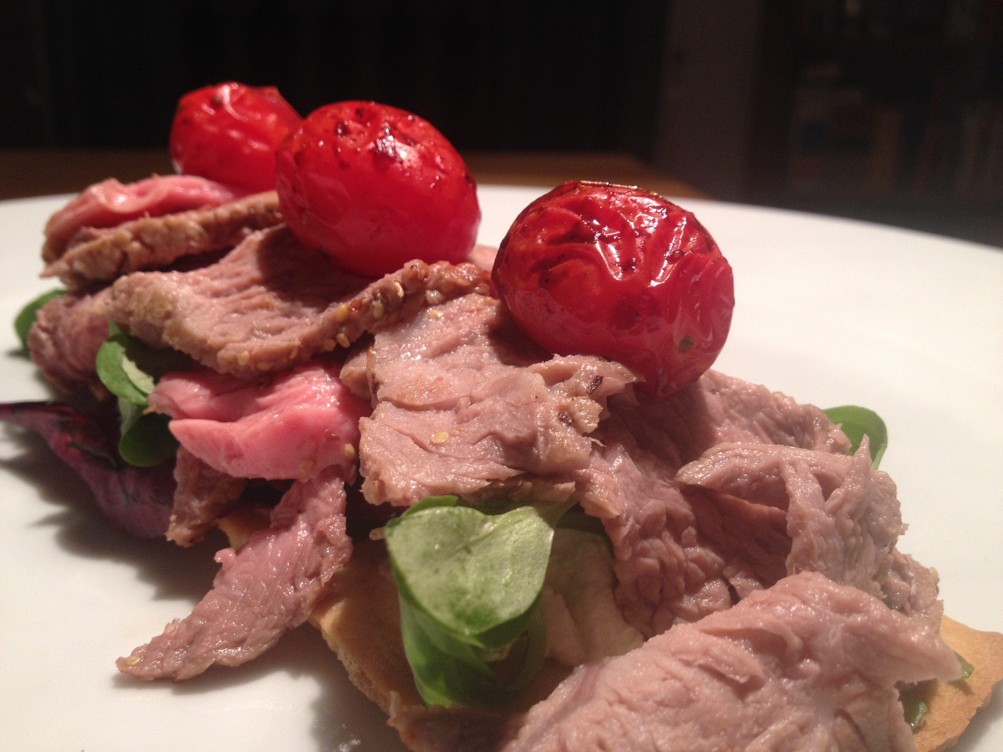 Ahora colocamos unas lonchas de rosbif, tres tomatitos encima y espolvoreamos un poco de sal en escamas, que le subirán los sabores a la carne.