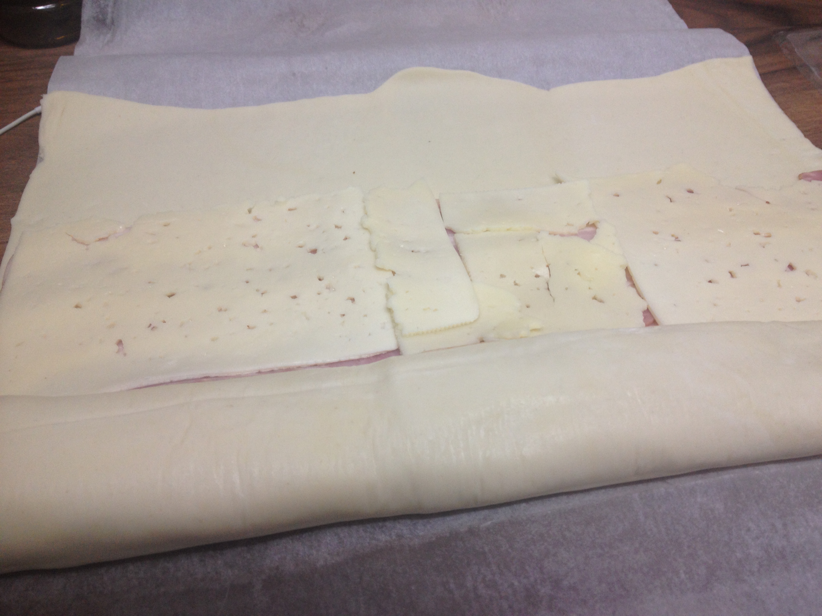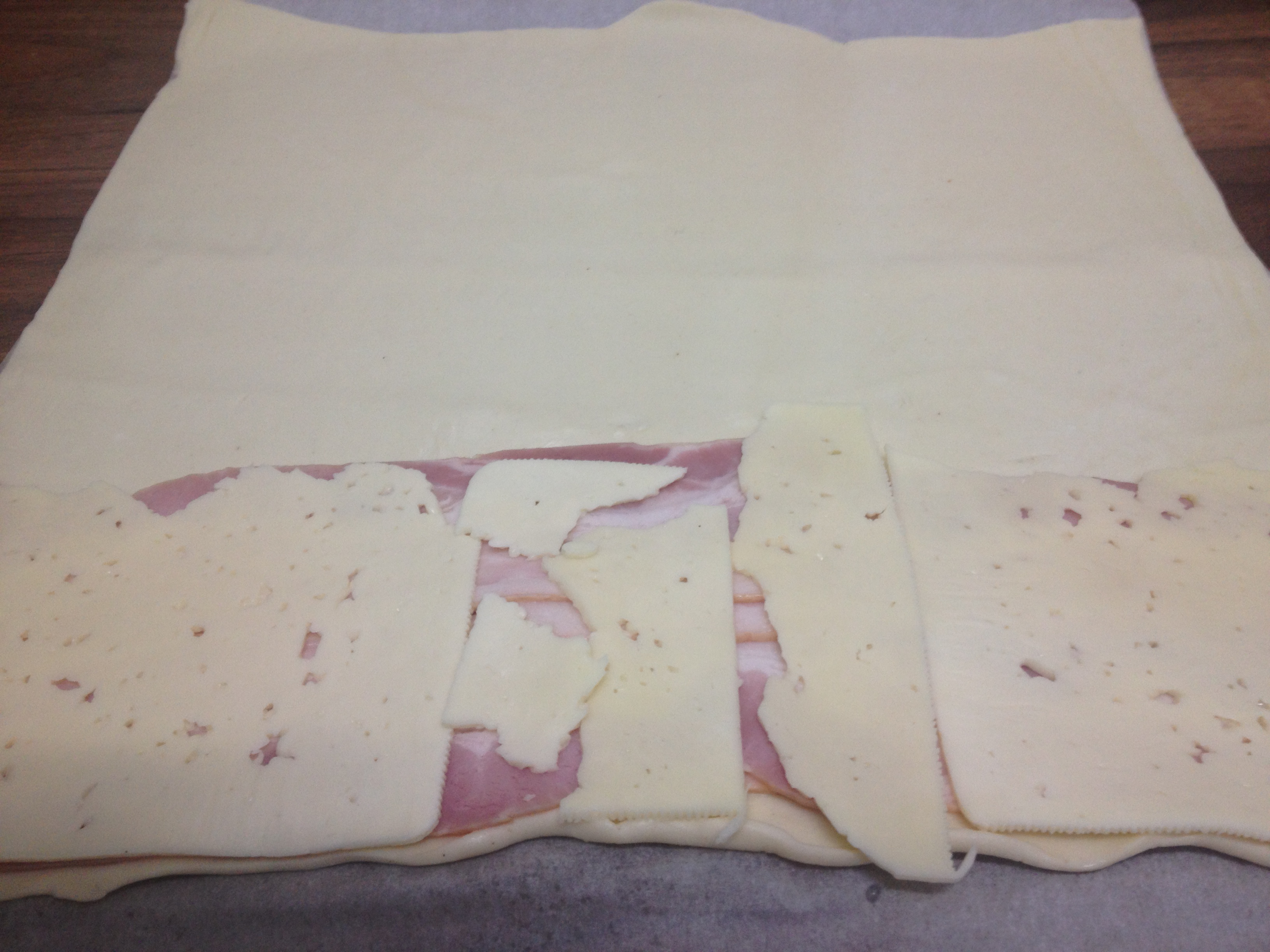 Precalentamos el horno a 200º. Extendemos la masa de hojaldre con un rodillo sobre el papel que trae y colocamos 4 lonchas de jamón y dos de queso, cubriendo el máximo de superficie.