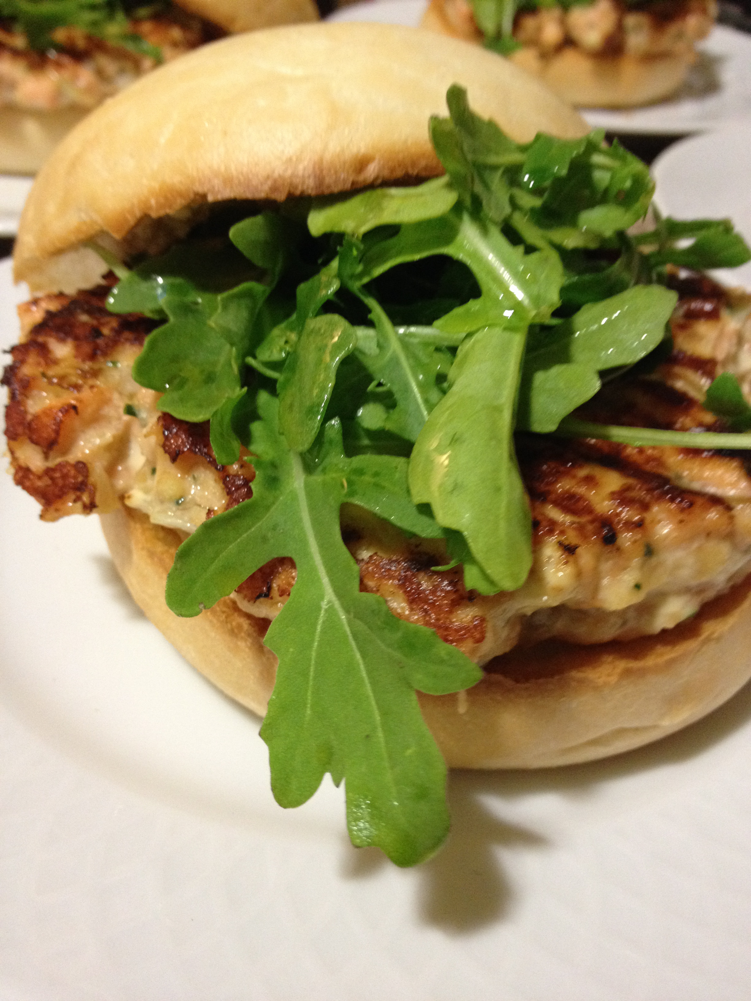Mientras, aliñamos la rúcula con un poco de aceite de oliva y sal y tostamos el pan en el horno o tostadora. Pasado el tiempo, ponemos cada hamburguesa en un pan con un buen montoncito de rúcula y listos. Si queréis ponerle alguna salsa, como veáis, pero la propia hamburguesa ya tiene mil sabores que merecen la pena por sí solos, así que yo no me complicaría mucho.