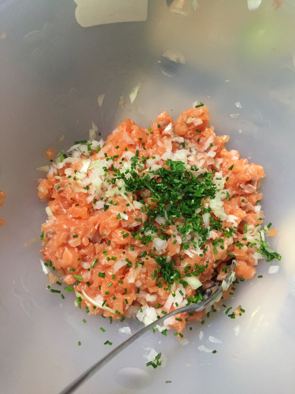 Lo primero que debemos hacer es retirar la piel del salmón con el cuchillo. Intentad no llevaros mucha carne con la piel, y me controláis que no queden espinas tampoco. Una vez quitadas las pieles, con un cuchillo bien afilado tenemos que ir haciendo filetillos y de cada uno de estos, cortarlos a cuadritos bien pequeños. En un poco trabajo de chinos y las manos quedan un poco con olor a asca, pero merece la pena. Después de cortar todo el puto salmón, añadimos la cebolla tierna troceada muy pequeñita también y procedemos a incorporar el resto de ingredientes en la mezcla.