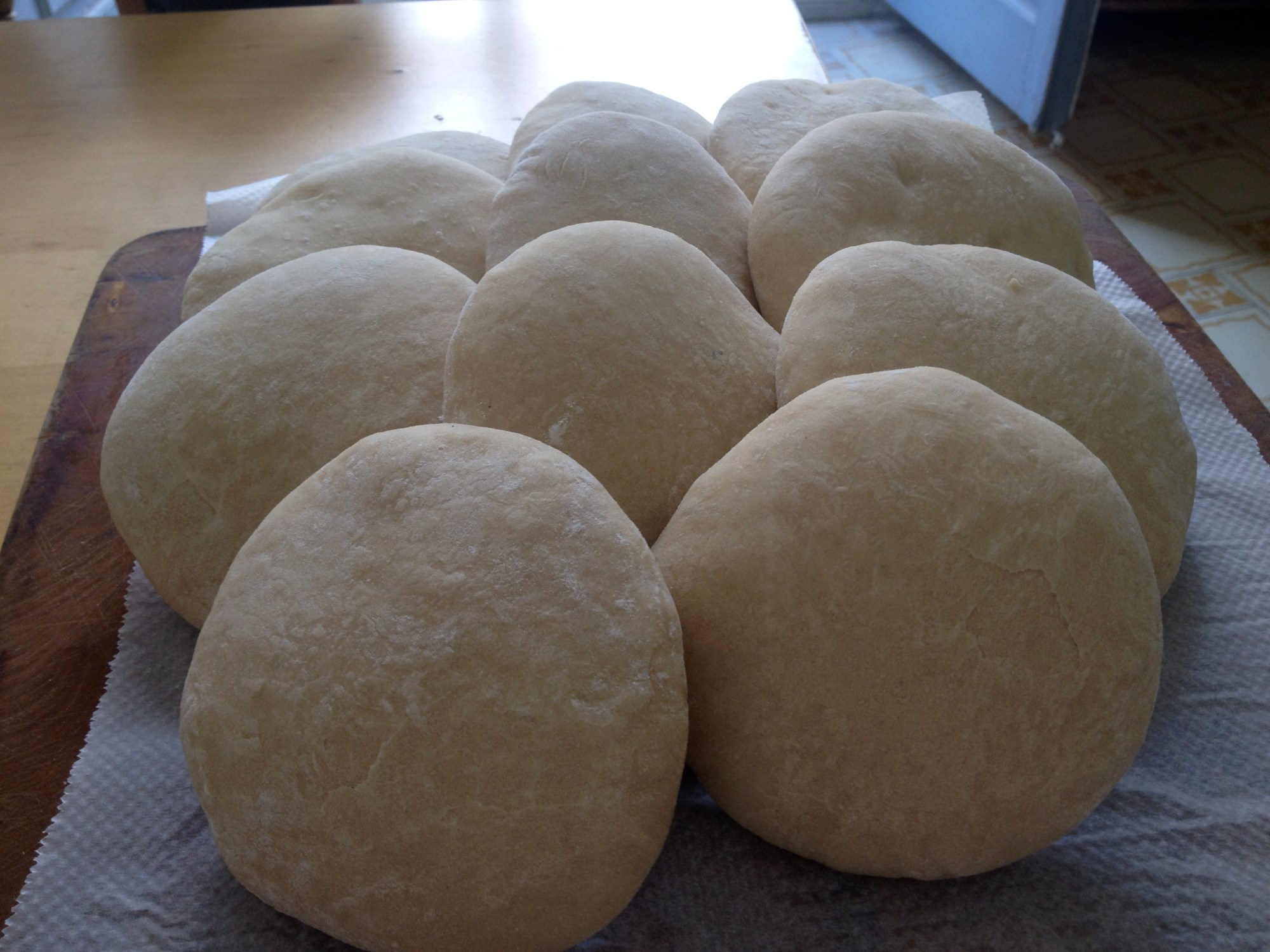 Cuando ya hemos amasado, tapamos la masa y la dejamos reposar 2 horas tapada en algún sitio cálido. Cuando la destapéis, veréis que la masa ha doblado el volumen. Volcamos la masa sobre una encimera limpia, no me seáis guarras, y sin manipularla como si fuera un chulazo, cortamos bolas de entre 90-100 gr. Si las manipulas mucho, perderá el gas que ha ganado fermentado y tendrás que esperar más tiempo, por pringado.