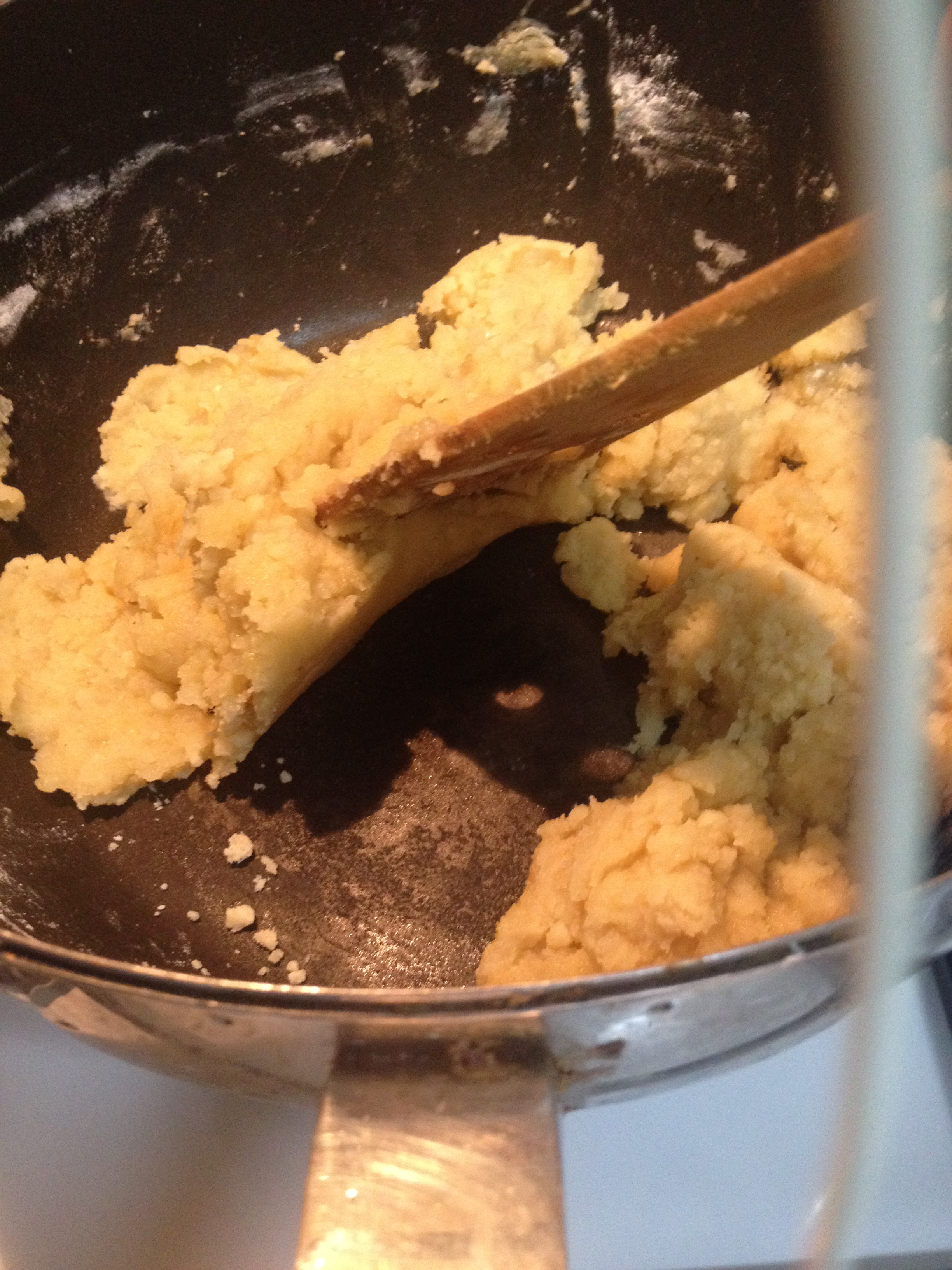 Ahora incorporamos fuera del fuego poco a poco la leche hirviendo a la pasta mientras removemos continuamente con unas varillas. Rallamos un poquito de nuez moscada y la añadimos a la masa.Cuando esté toda la leche incorporada, veréis que queda bastante fina, pero igualmente vamos a pasarle la batidora para refinarla más.