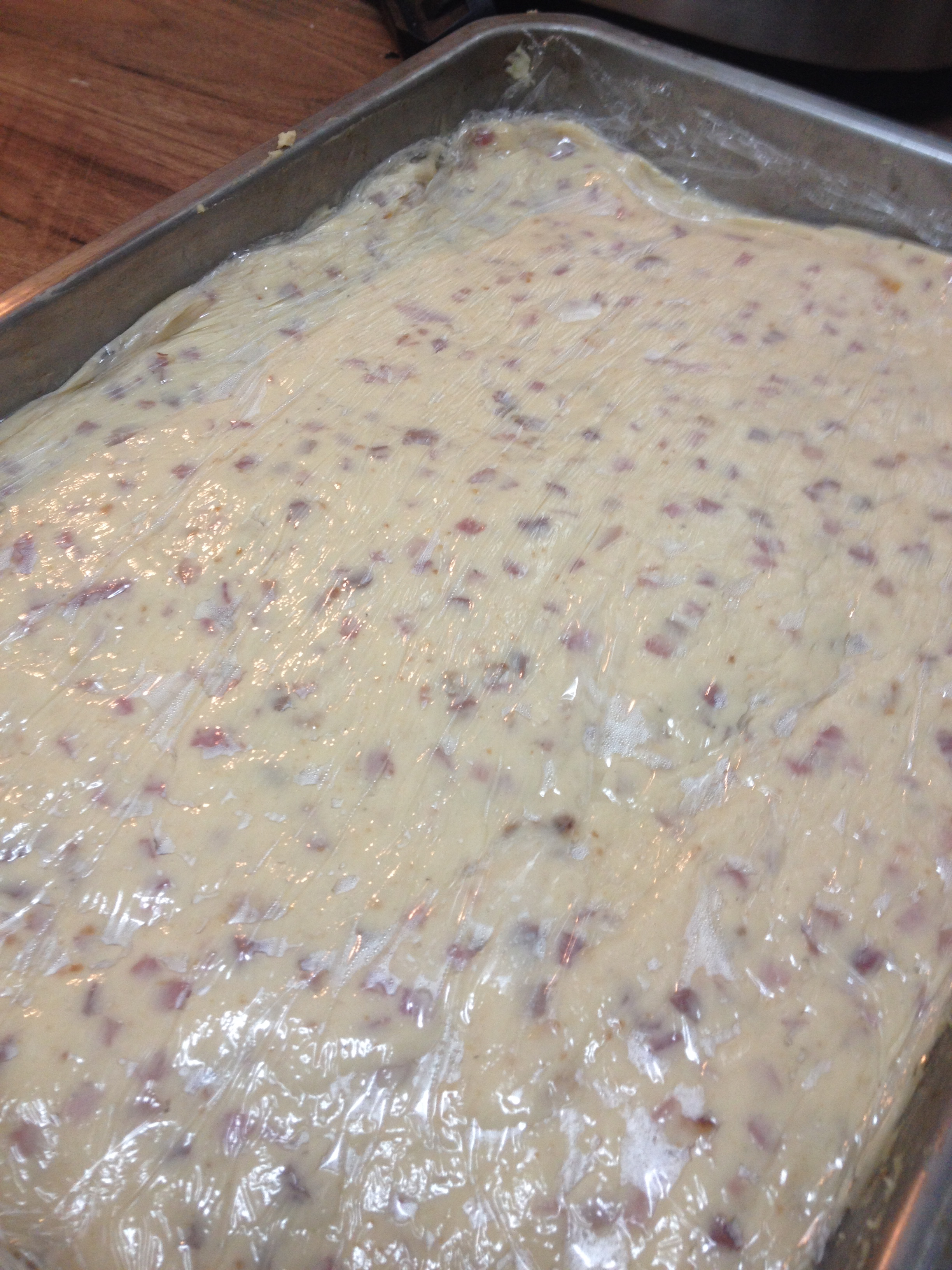 Echamos la masa en una bandeja y ponemos un film pegado directamente a la masa para que no se forme costra. Guardamos en la nevera al menos 12h, pero si podéis, de un día para otro.