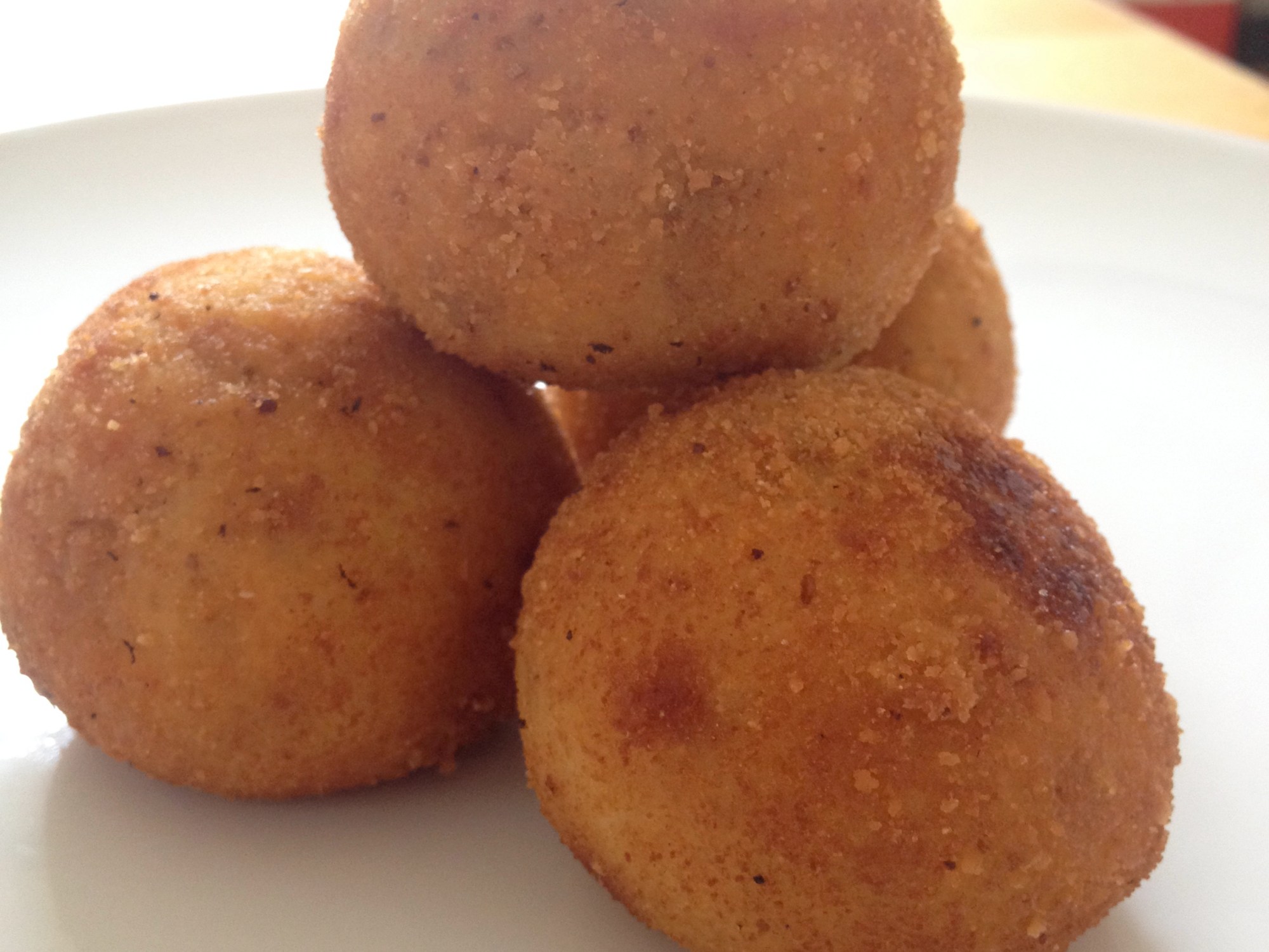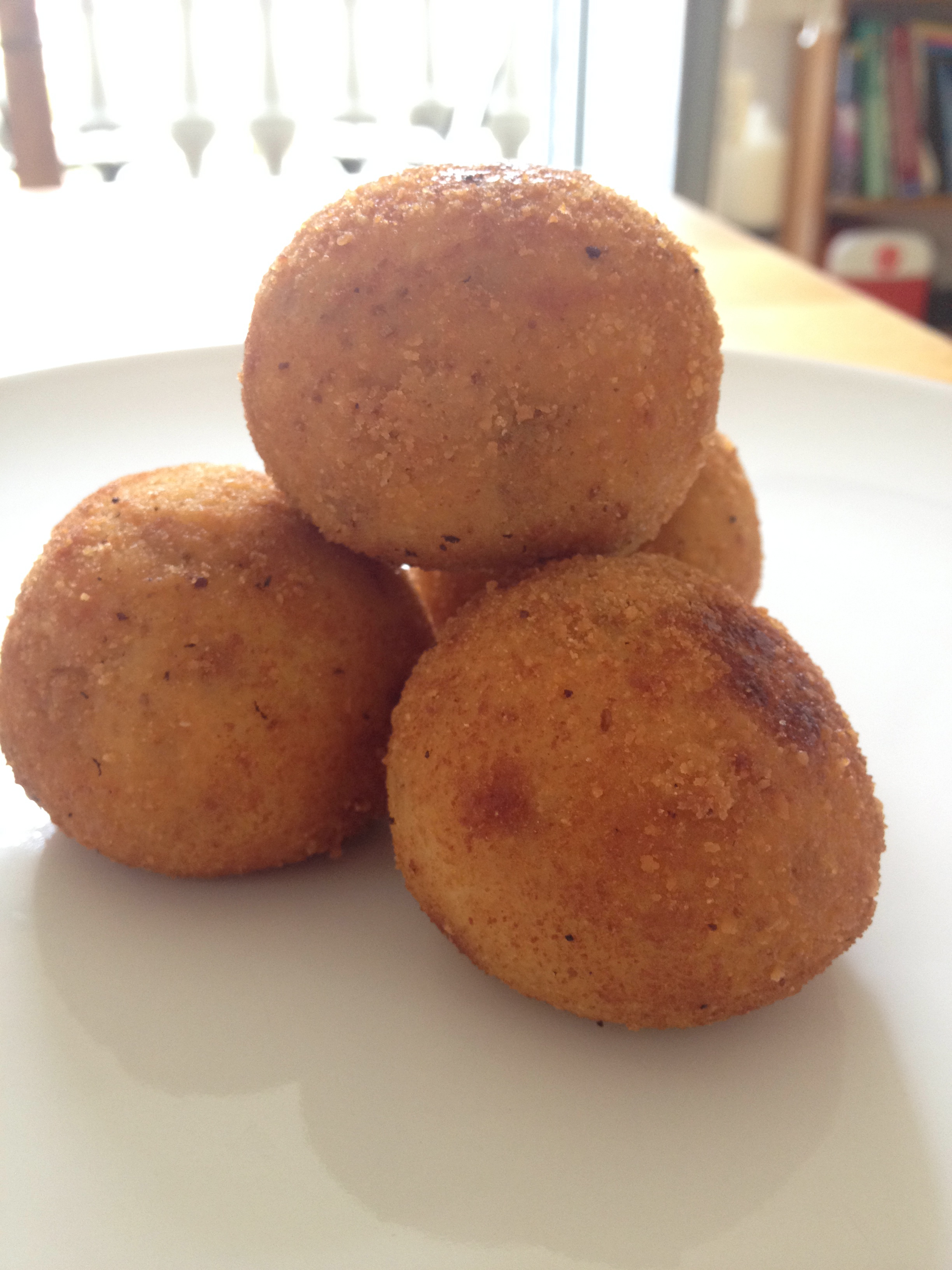 Por fin ha llegado el momento de hacer las croquetas. Sacamos la masa de la nevera, ponemos un chorrito de aceite en un bol para mojarnos las manos con cada croqueta y vamos formando bolas del tamaño de una pelota de golf. No hay drama si queréis darle otra forma. Con cada bola, nos mojamos las manos de aceite. Una vez formadas las bolas, ponemos en un plato, tapamos con film y dejamos reposar un par de horas en la nevera para que la masa tenga buena consistencia al rebozar.