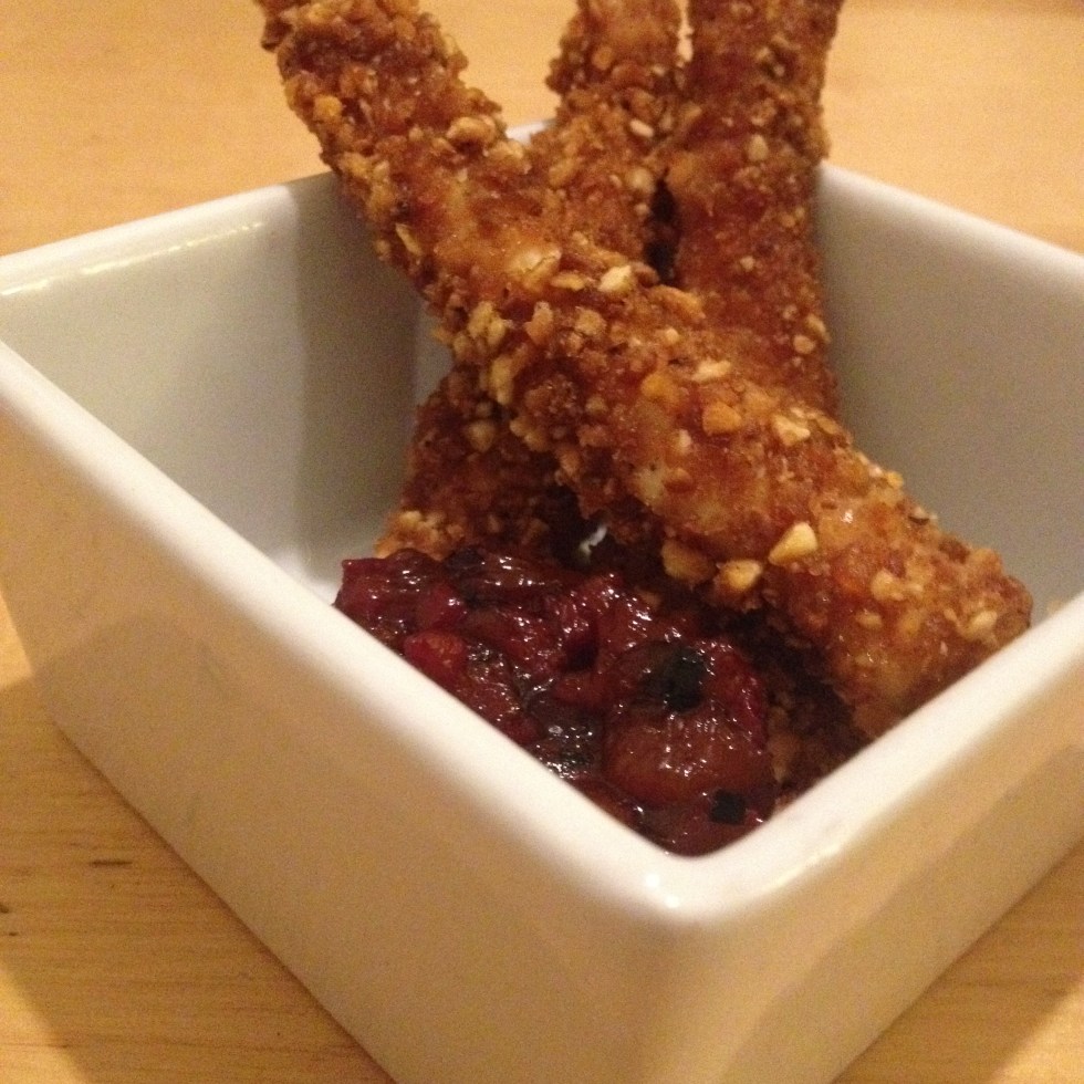 Fingers de pollo rebozado en kikos con mermelada de pimientos