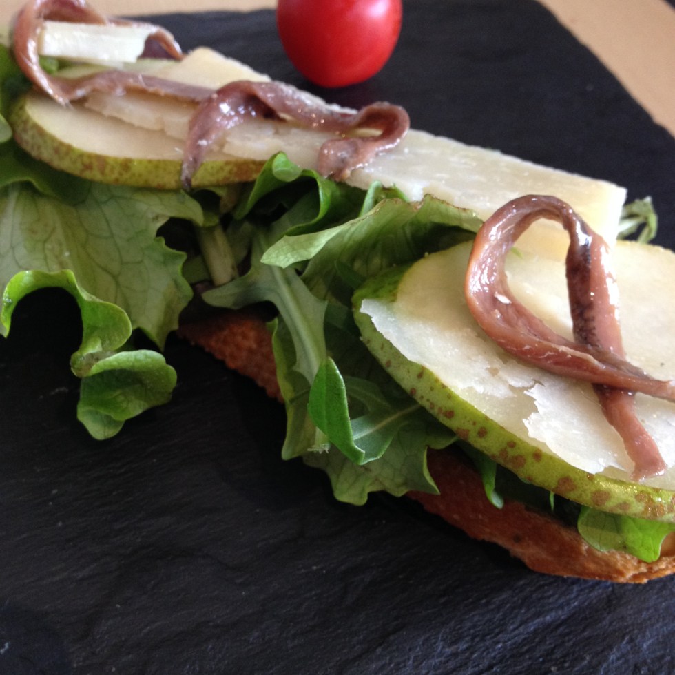 Tosta de pera, anchoas, idiazabal y pesto.