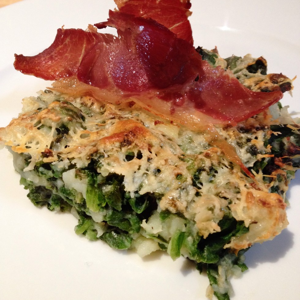Gratén de acelgas y patata con idiazábal y crujiente de jamón
